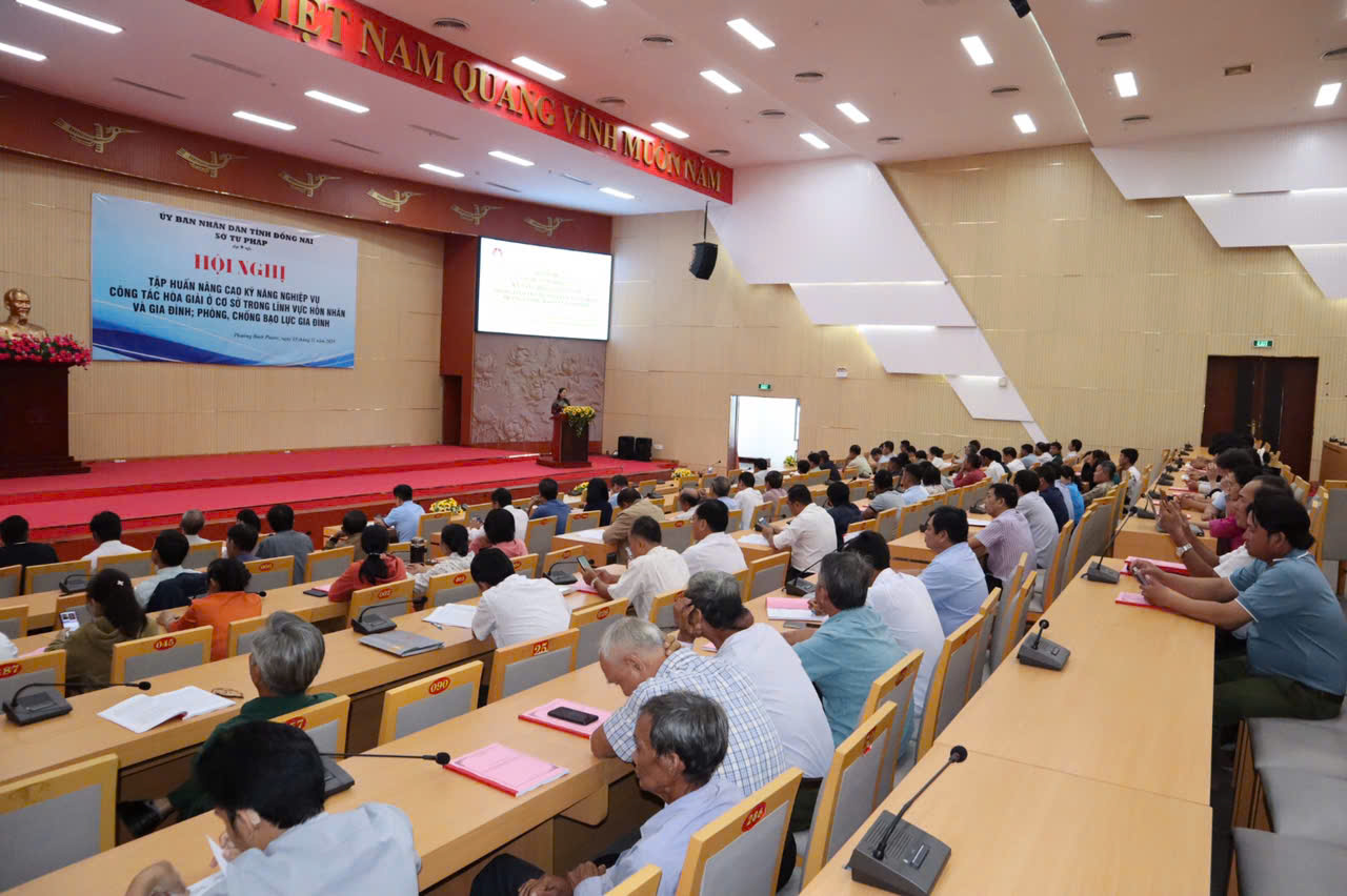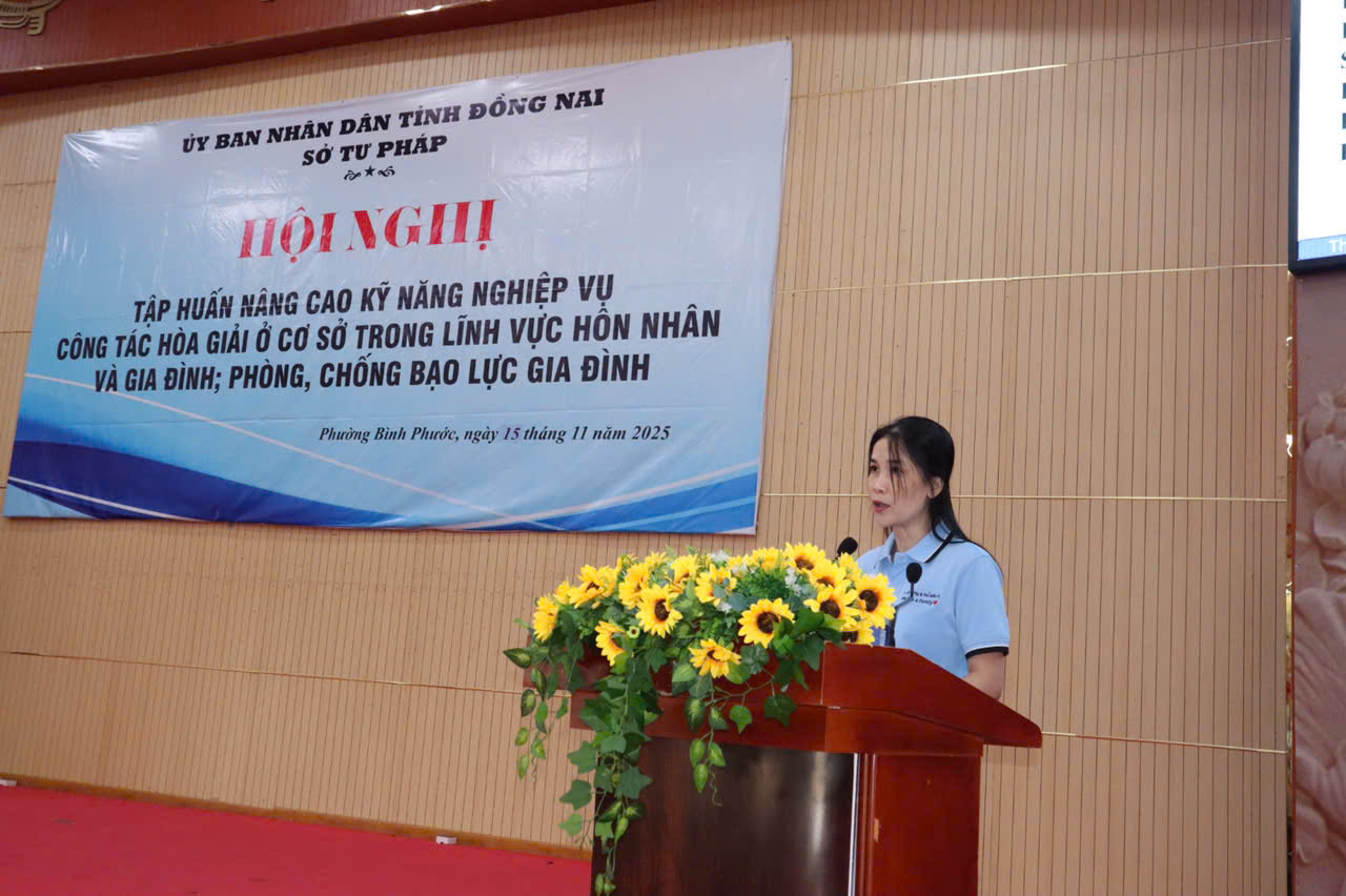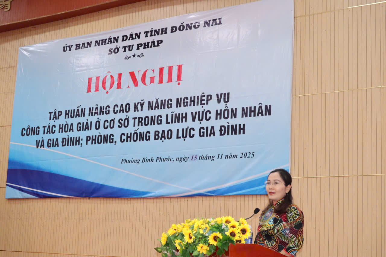 Vào lúc 08h00 ngày 15/11/2025 (thứ Bảy), tại Trung tâm Hội nghị Trường Chính trị (số 68 Trường Chinh, phường Bình Phước, tỉnh Đồng Nai), Sở Tư pháp đã tổ chức Hội nghị tập huấn nâng cao kỹ năng, nghiệp vụ công tác hòa giải ở cơ sở trong lĩnh vực hôn nhân và gia đình, phòng chống bạo lực gia đình. Hội nghị có sự tham dự của 335 đại biểu là hòa giải viên ở cơ sở.