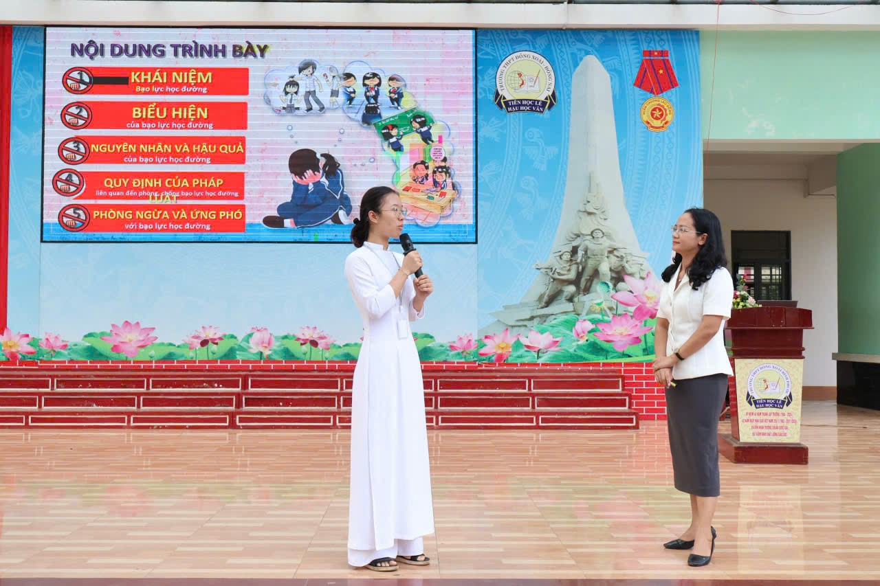Tại buổi tuyên truyền, báo cáo viên đã hệ thống hóa vấn đề bạo lực học đường, làm rõ khái niệm và các hình thức phổ biến như bạo lực thể chất, tinh thần, ngôn từ và bạo lực trên không gian mạng. Trên cơ sở đó, báo cáo viên đã phân tích nguyên nhân từ cả yếu tố chủ quan (tâm lý, nhận thức học sinh) và khách quan (gia đình, nhà trường, xã hội), đồng thời cảnh báo những hệ lụy nghiêm trọng, lâu dài đối với sức khỏe, học tập và nhân cách. Bên cạnh đó, nội dung còn cập nhật các quy định pháp luật, chế tài xử lý và trách nhiệm liên quan. Phát biểu tại chương trình, bà Phan Thị Vân cũng đồng thời nhấn mạnh việc tăng cường trang bị kiến thức pháp luật cho học sinh, nhất là trước diễn biến phức tạp của hành vi vi phạm trên môi trường mạng; đồng thời khuyến khích các em chủ động tìm kiếm sự hỗ trợ khi cần thiết.